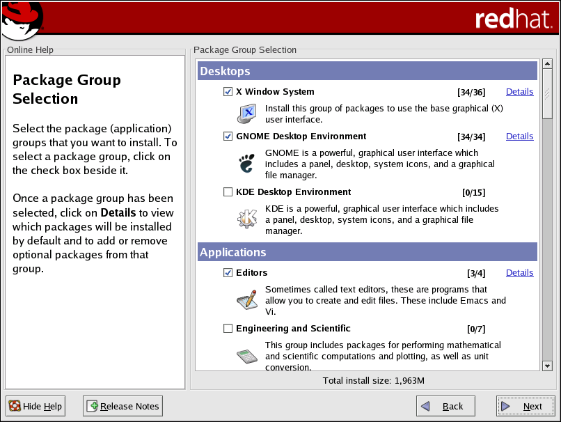 You can select package groups, which group components together according to function (for example, X Window System and Editors), individual packages, or a combination of the two.
