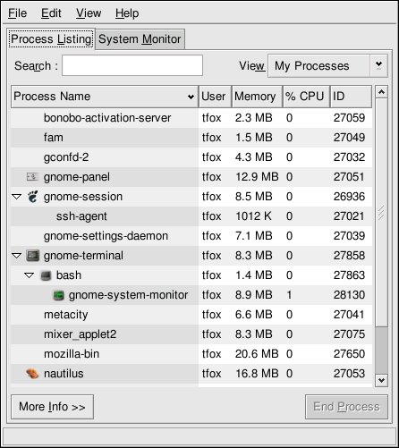 If you prefer a graphical interface for top, you can use the GNOME System Monitor. To start it from the desktop, select Main Menu Button (on the Panel) => System Tools => System Monitor or type gnome-system-monitor at a shell prompt from within the X Window System. Then select the Process Listing tab.