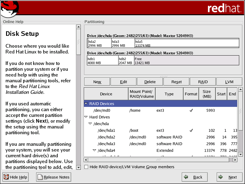 | If you are making a RAID partition of /boot, you must choose RAID level 1, and it must use one of the first two drives (IDE first, SCSI second). If you are not creating a RAID partition of /boot, and you are making a RAID partition of /, it must be RAID level 1 and it must use one of the first two drives (IDE first, SCSI second). |