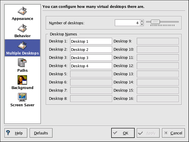 The Appearance, Behavior, and Paths, and Background icons are where you can make various desktop configuration changes. For example, to customize each virtual desktop to have different backgrounds, click the Background icon, uncheck the Common Background checkbox, click the virtual desktop you want to change, and choose the color or image you want to make your background using the associated tabs.