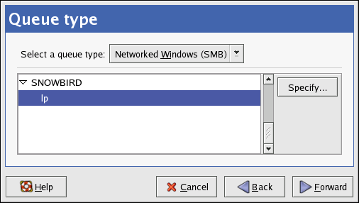 Select Networked Windows (SMB) from the Select a queue type menu, and click Forward. If the printer is attached to a Microsoft Windows system, choose this queue type.