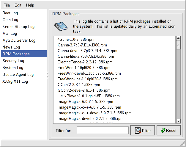 To view system log files in an interactive, real-time application, use the Log Viewer. To start the application, go to Applications (the main menu on the panel) => System Tools => System Logs, or type the command system-logviewer at a shell prompt.