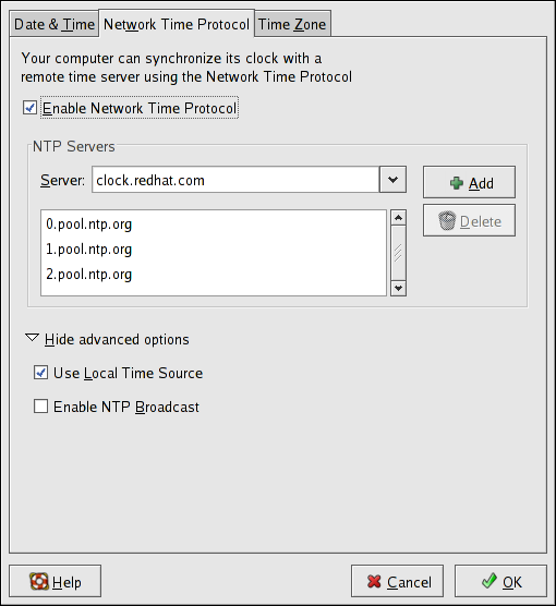 The Network Time Protocol (NTP) daemon synchronizes the system clock with a remote time server or time source (such as a satellite). The application allows you to configure an NTP daemon to synchronize your system clock with a remote server. To enable this feature, select Enable Network Time Protocol. This enables the Server pulldown menu. You can choose one of the predefined servers or type a server name in the pulldown menu. Your system does not start synchronizing with the NTP server until you click OK. After clicking OK, the configuration is saved and the NTP daemon is started (or restarted if it is already running).