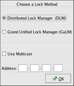 For a new configuration, a Lock Method dialog box is displayed requesting a choice of either the GULM or DLM lock method (and multicast address for DLM).