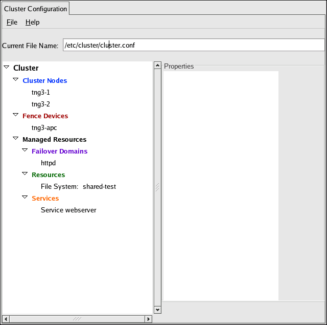 For example, to configure an existing node, click the triangle icon next to the Cluster Nodes property and select the node. Three buttons appear in the Properties portion of the window. Click Edit Node Properties.
