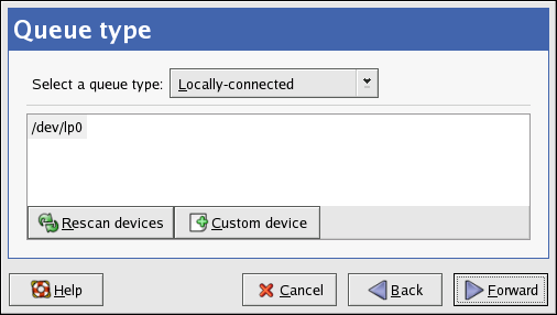 After clicking Forward, Figure 34-4 appears. Select Locally-connected from the Select a queue type menu, and select the device. The device is usually /dev/lp0 for a parallel printer or /dev/usb/lp0 for a USB printer. If no devices appear in the list, click Rescan devices to rescan the computer or click Custom device to specify it manually. Click Forward to continue.