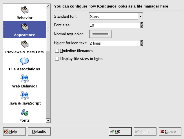 The configuration window opens. in the left pane is a list of icons representing the types of customizatins you can make. Clicking on each icon in turn displays customization options. For example, the Appearance icon allows you to select the font face and size of your Konqueror windows. Browse through the various options and make your selections. Click the Apply button to save your changes, and finally click the OK button to exit the configuration window.