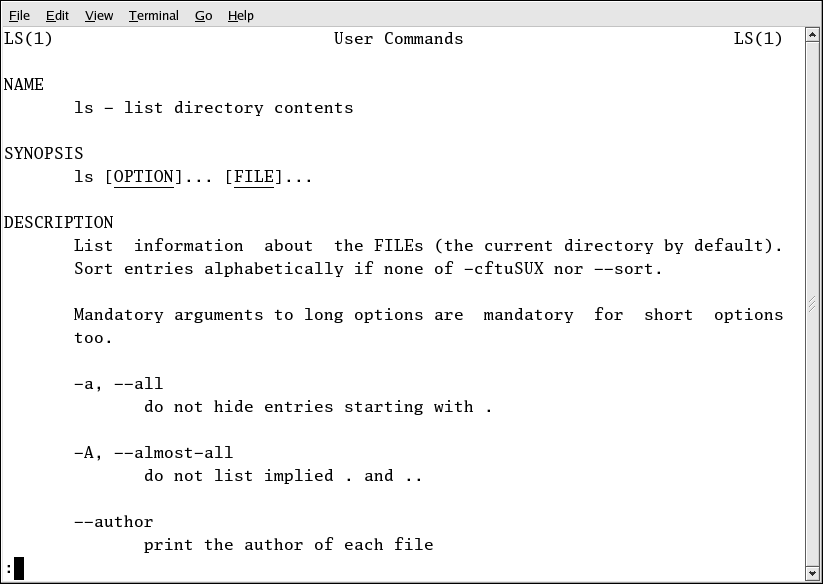 Applications, utilities, and shell prompt commands usually have corresponding manual pages (also called man pages) that show the reader available options and values of file or executable. Man Pages are structured in such a way that users can quickly scan the page for pertinent information, which is important when dealing with commands that they have not previously encountered.